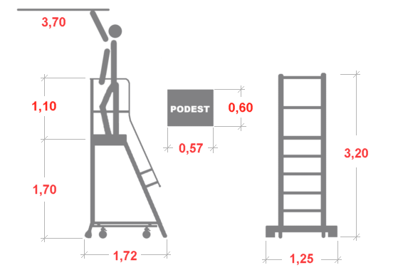 Składana, lekka, mobilna konstrukcja gwarantuje wygodny transport. Wejście pod kątem 60 stopni oraz stopnie o głębokości 15 cm podnoszą bezpieczeństwo i komfort pracy. Kąt prosty tylnego profilu umożliwia bliskie umiejscowienie sprzętu, np. przy regałach, co bardzo usprawnia pracę.