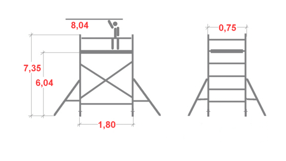 - Składa się z ram (0.75x2,00m), które posiadają nowe złącza ze stali nierdzewnej oraz bez spawów, co sprawia że rusztowanie jest sztywne i wytrzymałe.